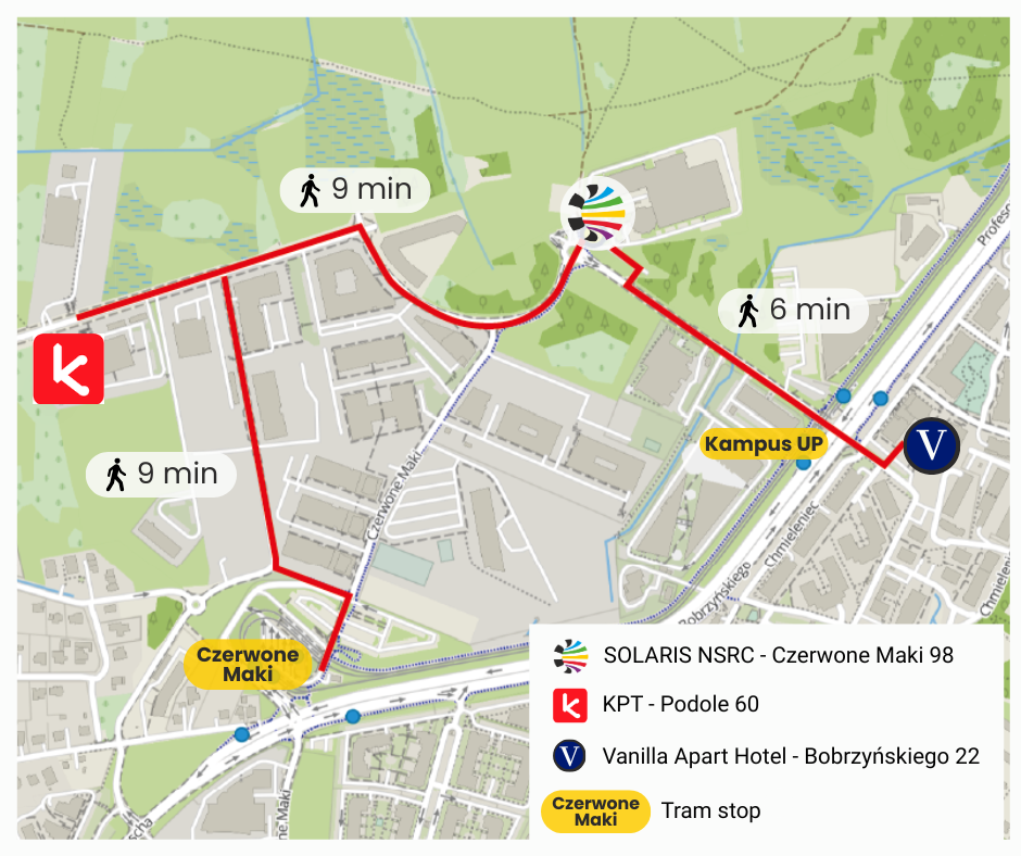 A journey with one stopover. First take the bus number 300, then go to the tram stop and take the tram number 18 or 52. The bus no. 252 runs from the Kraków Airport every half hour from 5:00 a.m. to 11:00 p.m. and the fare is 6,00 PLN (approx. 1,50 euro, a 90-minute agglomeration ticket). You have to get on the bus at the Kraków Lotnisko / Airport bus stop. You must get off the bus at the Rondo Grunwaldzkie bus stop (formerly Centrum Kongresowe ICE bus stop). Then you must cross the street to get to the Rondo Grunwaldzkie tram stop (formerly Centrum Kongresowe ICE tram sto, see the map below). Now take the tram no 18 or 52 in the direction of Czerwone Maki P+R. You must get off the tram at the last tram stop name Czerwone Maki P+R. Go straight to the end of Leona Sternbacha Street, turn left onto Podole Street, and on your left, you will see the building of the Krakow Technology Park. The route should take you about 8 minutes.