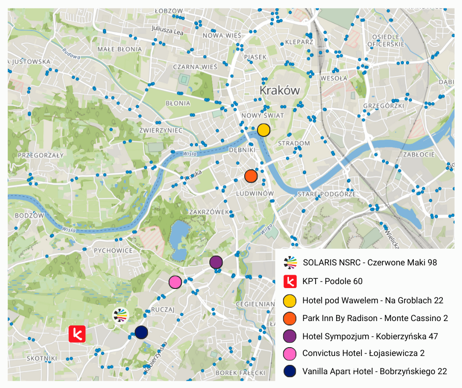 - Hotel Sympozjum**** ~ 270 - 300 PLN (approx. 62 - 68 Eur.) for single - double room / 2600 m to the SOLARIS Centre, contact: recepcja@sympozjum.com.pl